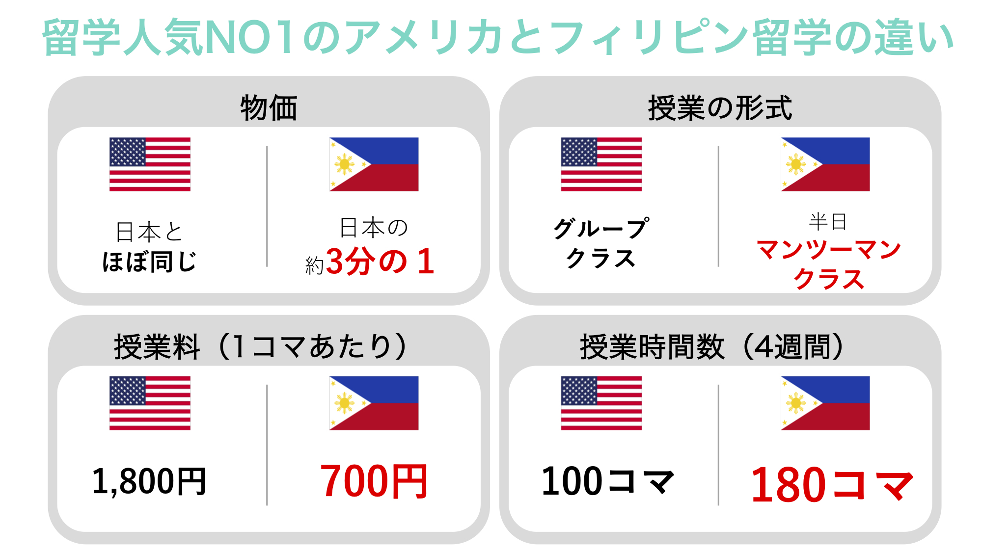 ここで、アメリカとフィリピン留学の費用の違いを見てみましょう。