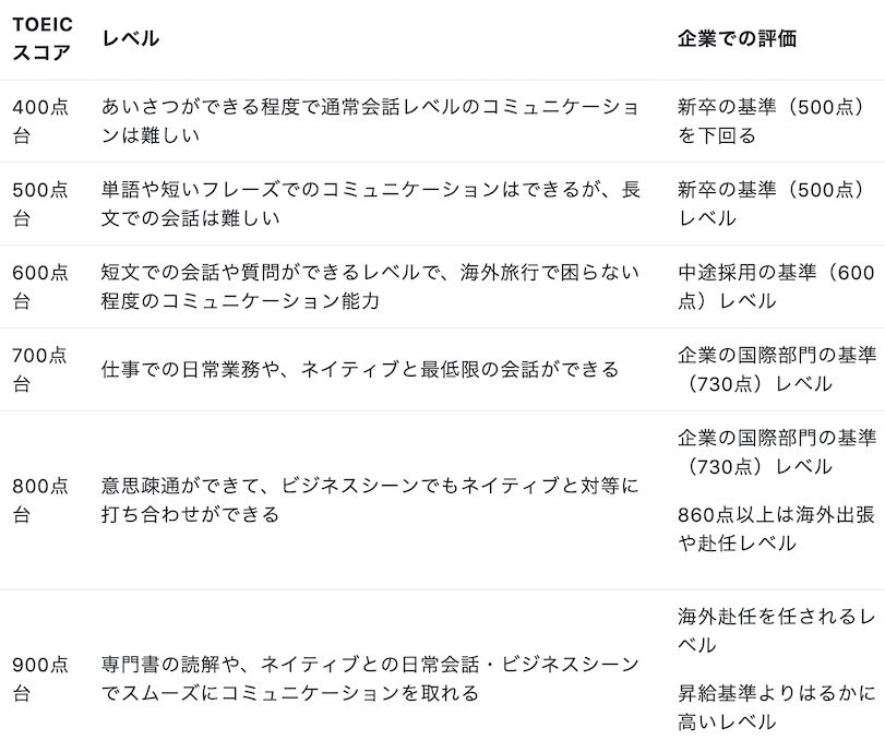 あわせて、TOEICのスコア別のレベルもご紹介するので、あなたの現在のレベルと、なりたいレベルに到達するために必要なTOEICスコアも理解しておいてくださいね。