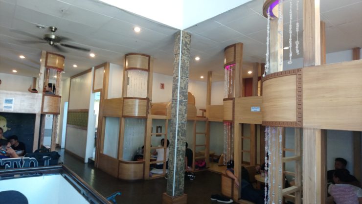 1階は一般のテーブル席が少しと、2段ベッドはありませんが、それぞれの靴を脱いでくつろげるブースがあります。