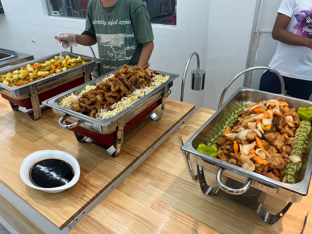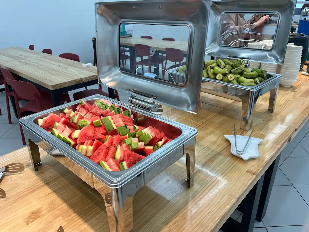 ビュッフェ形式で用意されており好きなものを好きなだけ取ることができます。2種類のご飯やおかず、スープ、サラダやフルーツの他ジュースなどもありました。留学すると野菜はきちんと取れるのか心配になると思いますが、こちらはサラダバーもあるので安心です!用意されているドレッシングは、フィリピンの甘いケチャップとマヨネーズを混ぜたオーロラソースのようなものだけだったので持参することをおすすめします。