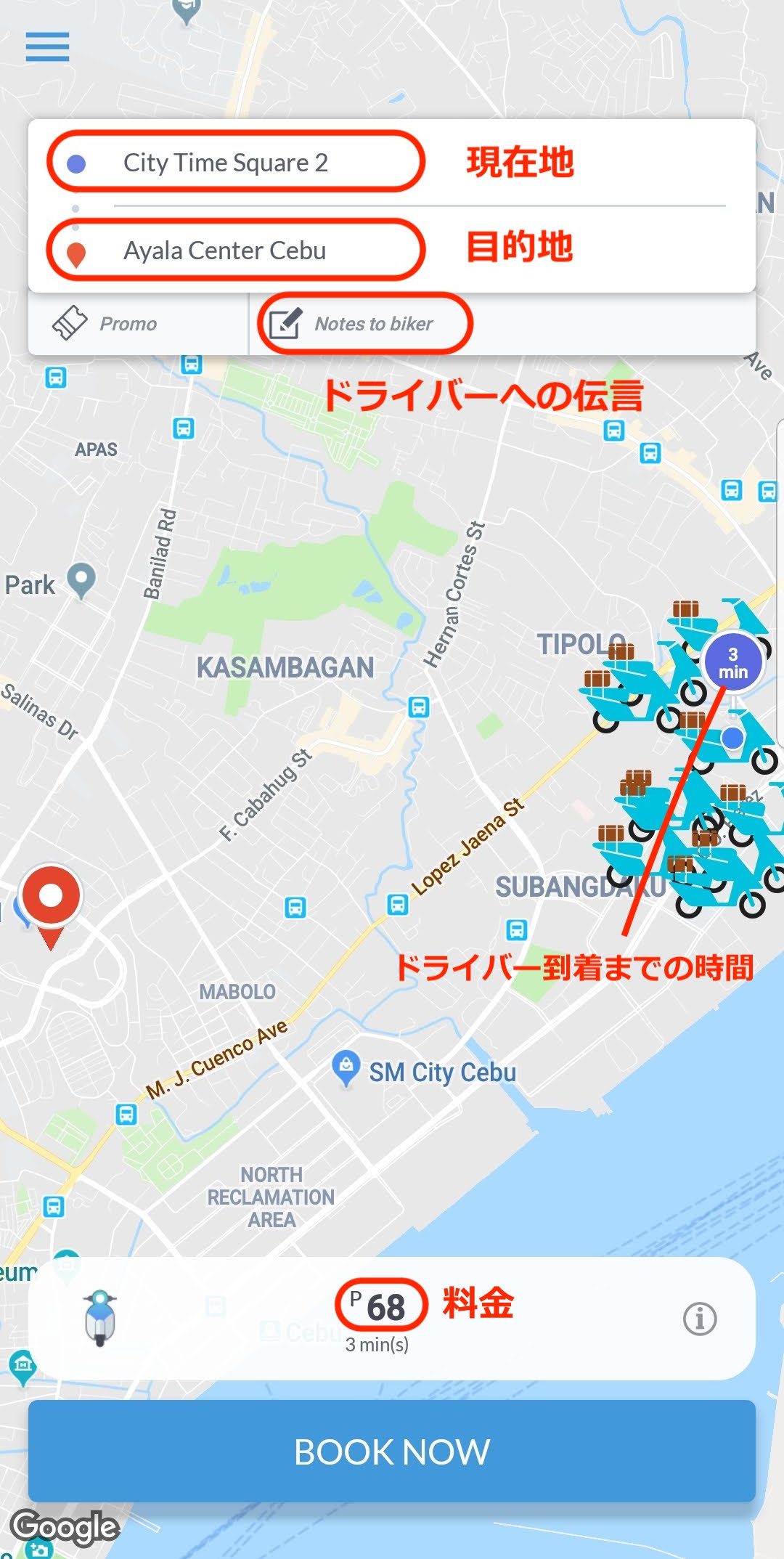 ドライバーの到着時間も確認し、BOOK NOWをタップすると自動でドライバーを探し始めます。