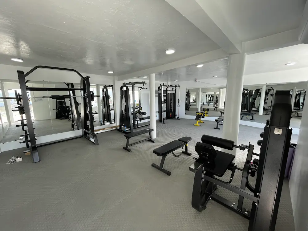 学校施設カフェテリア、屋外プール、中庭、ジム、食堂