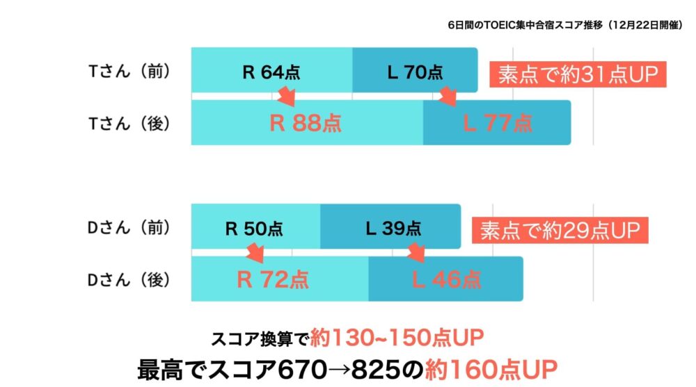 12月にECヴィレッジで開催されたTOEIC短期合宿では、1週間で約150点UP(素点31点UP)の好成績を残し、平均で100点以上のスコアアップに成功しています。