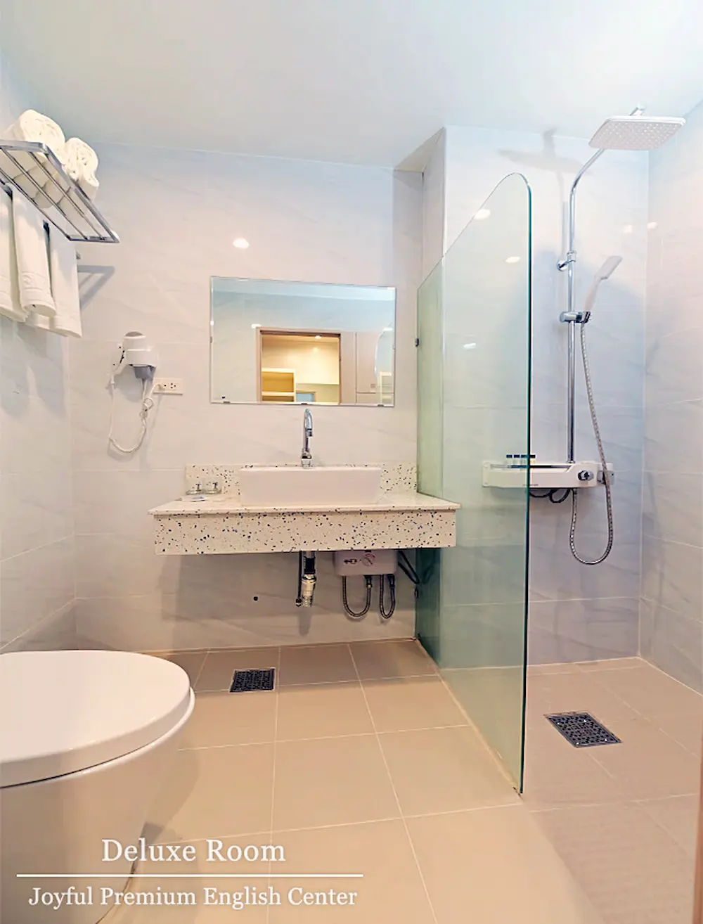 Joyful校ではトイレットペーパーを流すことができ、歯ブラシ、歯磨き粉、シャンプー、リンス、コンディショナー、ボディウォッシュ、石鹸、ティッシュ、水ペットボトル、インスタントの紅茶全てをリクエスト次第補充してくれるため、快適に過ごしていただけます。タオル類も無料で利用できます。