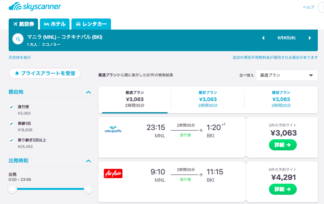 マニラ→コタキナバル 約1,500ペソ(約3,100円)〜(水、金曜発便)