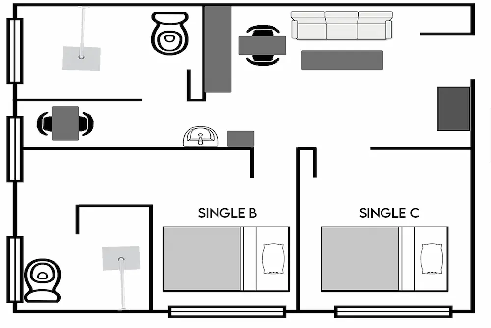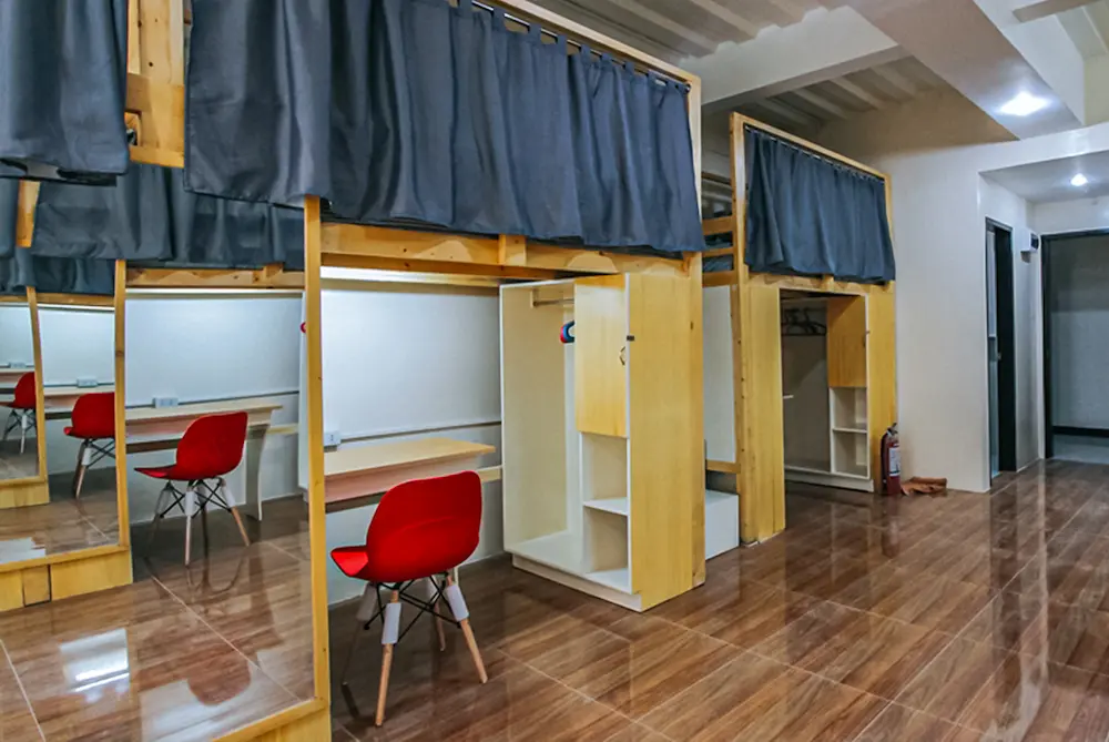 4人、6人部屋でも2段ベッド(1段目がテーブル、2段目がベッド)で、お部屋も十分なスペースとプライベート空間があるので快適に過ごすことができます。