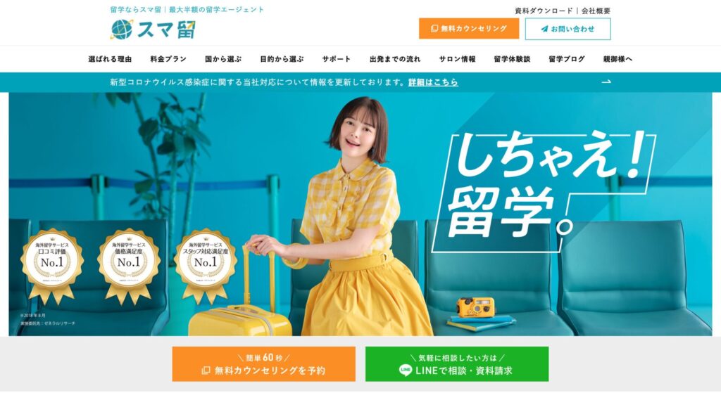スマ留は、他社に比べて最大50%オフという価格の安さが魅力の留学エージェントです。語学学校の空き時間や場所を有効活用するなどして、業界最安値を実現しています。また、渡航先(行きたい国)×渡航期間(学校へ通う期間)で価格が決まるシンプルな料金プランも特徴的です。